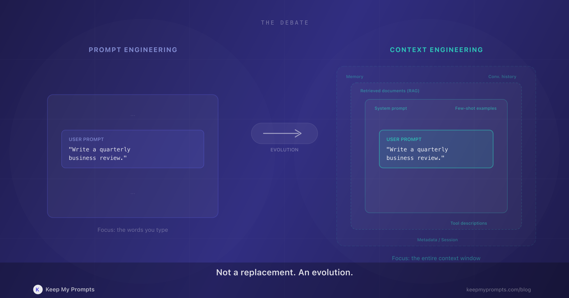 Context engineering is the natural evolution of prompt engineering, not its replacement. The skills are complementary, and the relationship is hierarchical: context engineering is the larger discipline that includes prompt engineering as a foundational component.