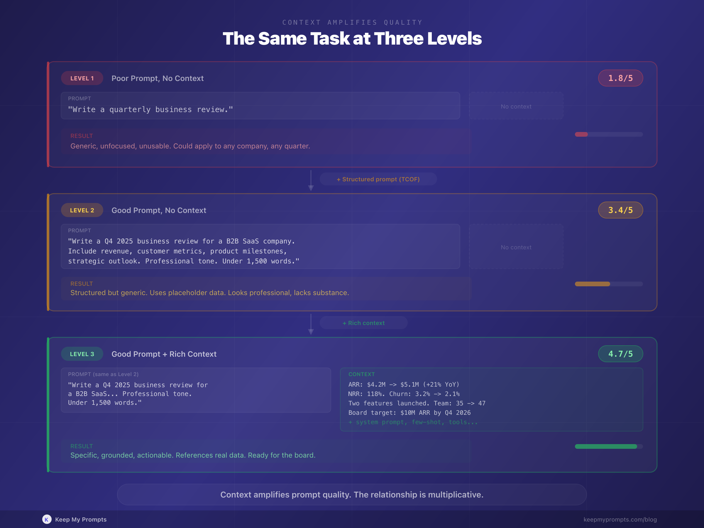 The third version is not better because context replaced the prompt. It is better because a structured prompt (following TCOF principles: Task, Context, Output, Format) combined with relevant context data to produce a result that is specific, grounded, and actionable.