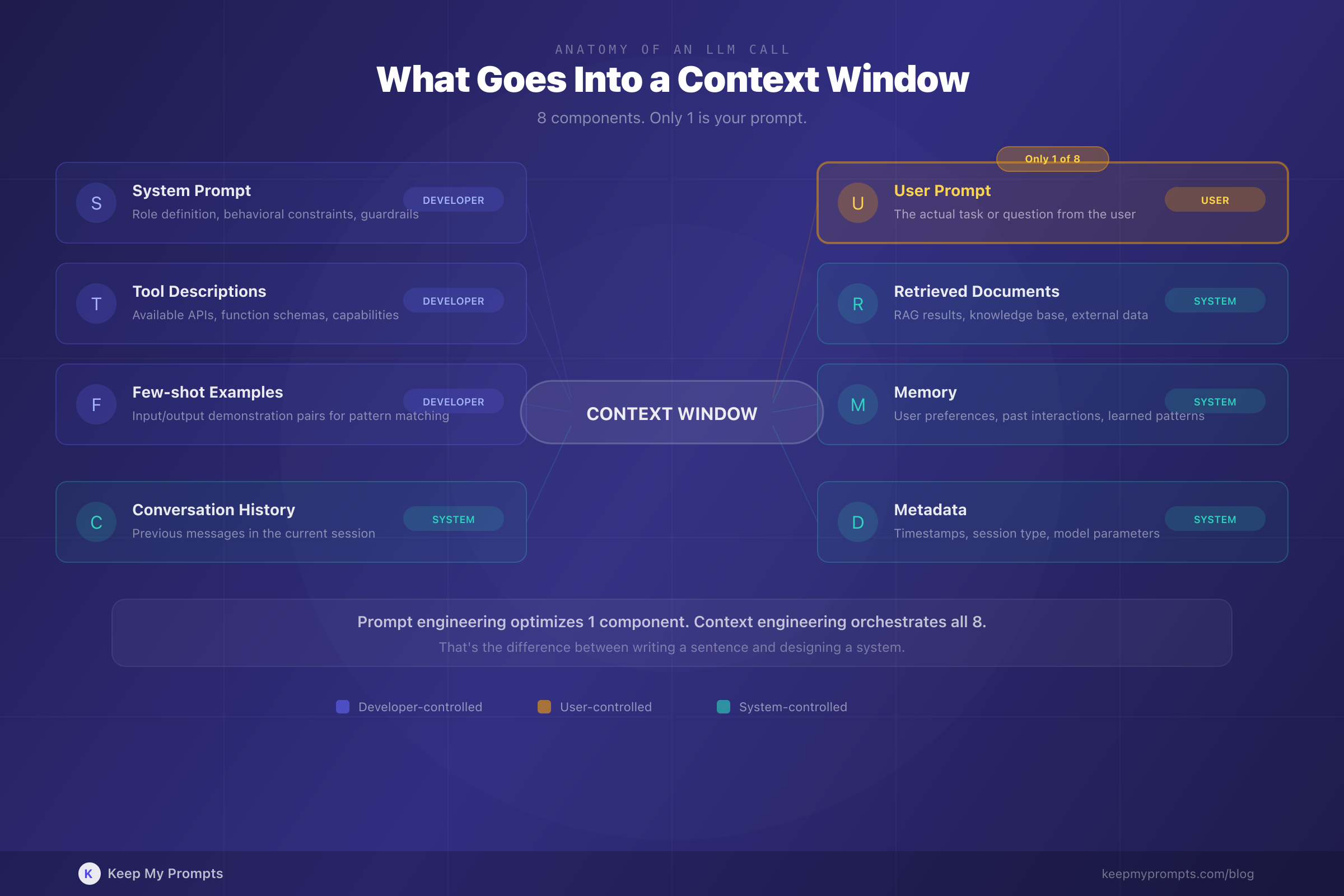 Prompt engineering, in its traditional definition, concerns primarily one row of this table: the user prompt. Context engineering concerns all eight.