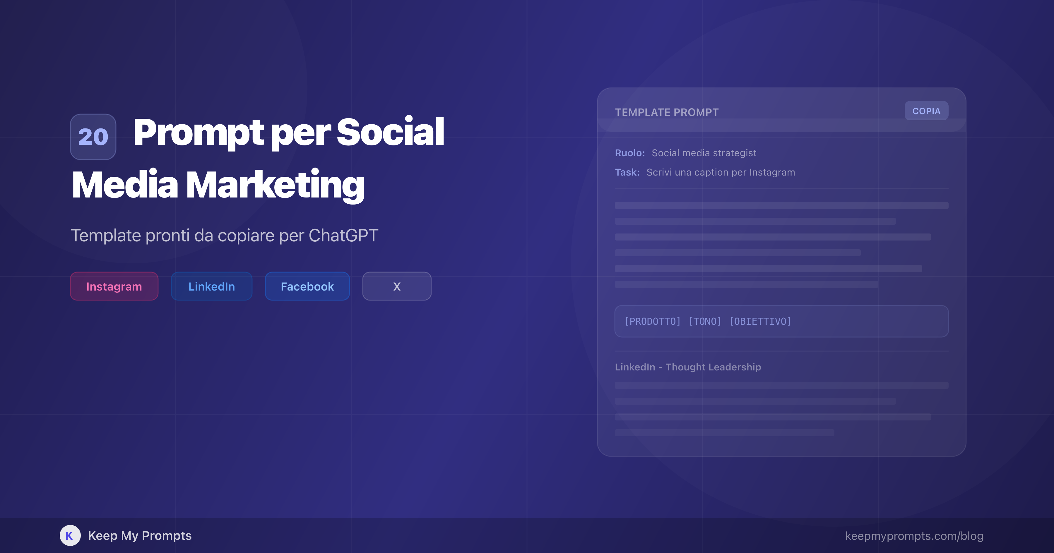 Come usarli: copia il prompt, sostituisci le variabili tra [parentesi quadre] con i tuoi dati, incolla in ChatGPT, Claude, Perplexity o qualsiasi altro assistente AI e ottieni contenuti pronti da pubblicare.