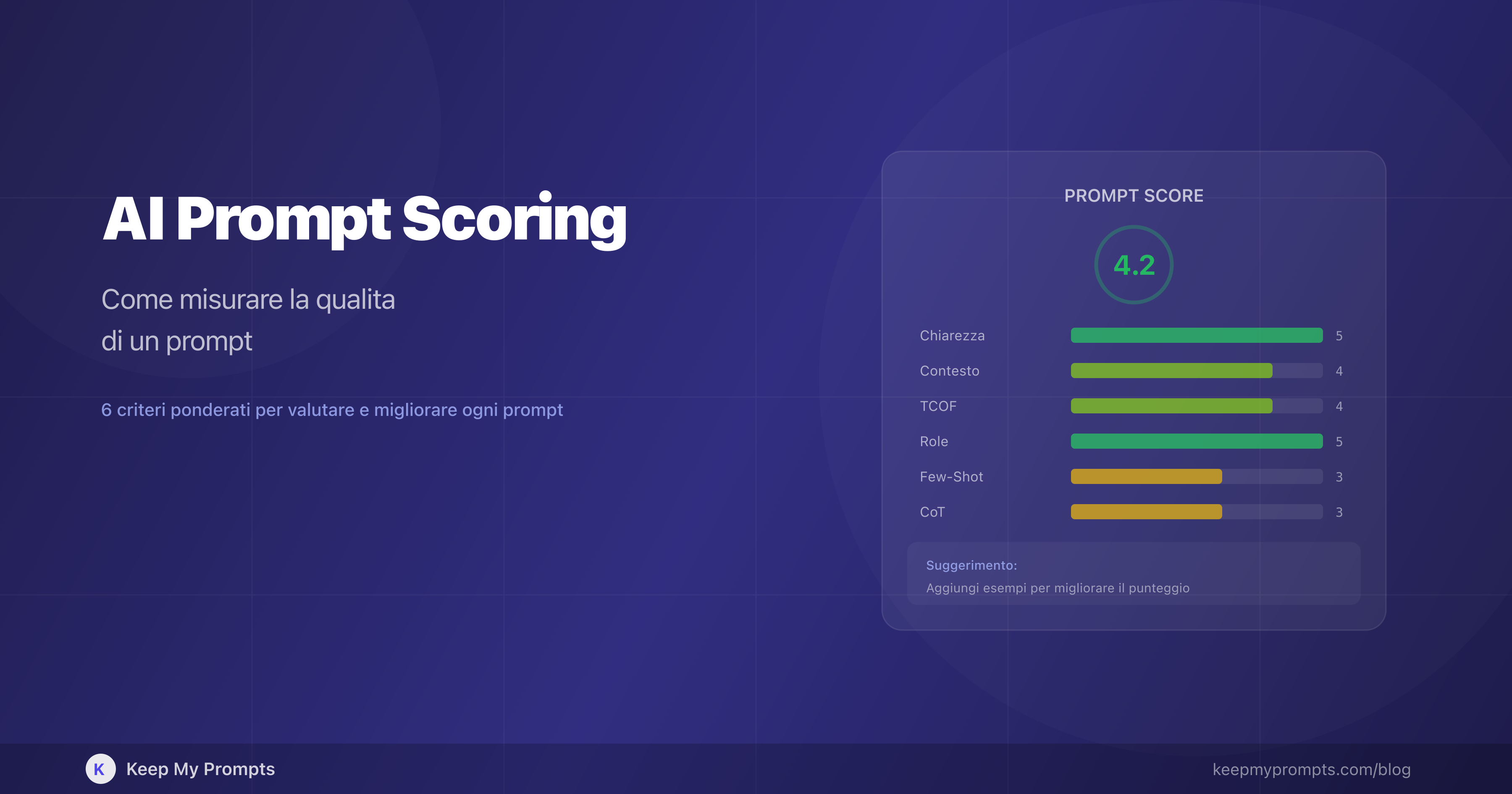 [Contesto] L'azienda è Keep My Prompts, una piattaforma per organizzare e ottimizzare prompt AI. La nuova feature è il "Prompt Score System": un sistema di valutazione automatica che analizza i prompt su 6 criteri e assegna un punteggio da 1 a 5. Il target sono professionisti che usano ChatGPT, Claude o Gemini quotidianamente per lavoro.