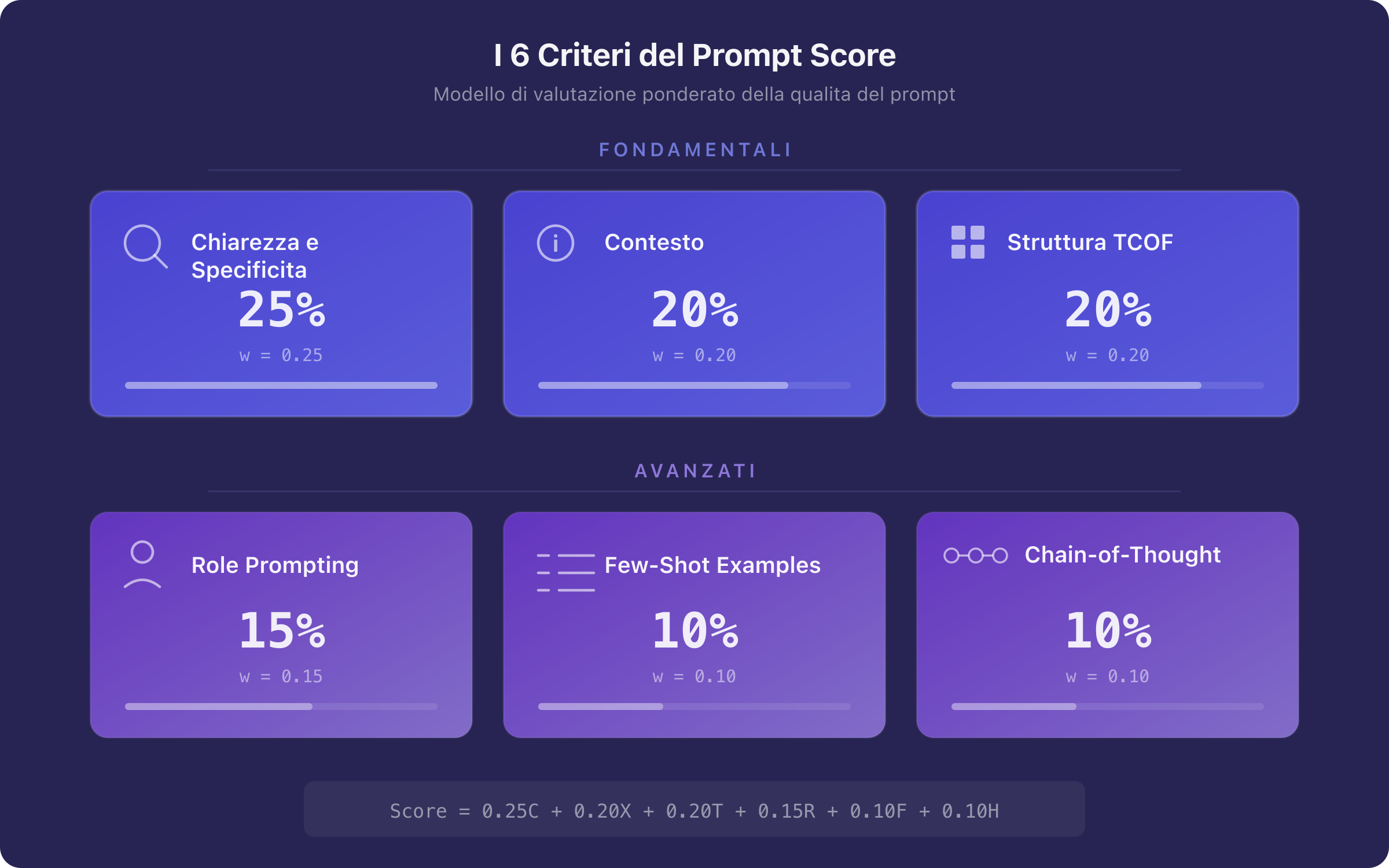 La ponderazione cattura questa asimmetria: i criteri fondamentali (chiarezza, contesto, struttura) hanno pesi maggiori perché il loro impatto è universale. I criteri avanzati (role prompting, few-shot, chain-of-thought) hanno pesi minori perché il loro impatto è condizionale — dipende dal tipo di task.