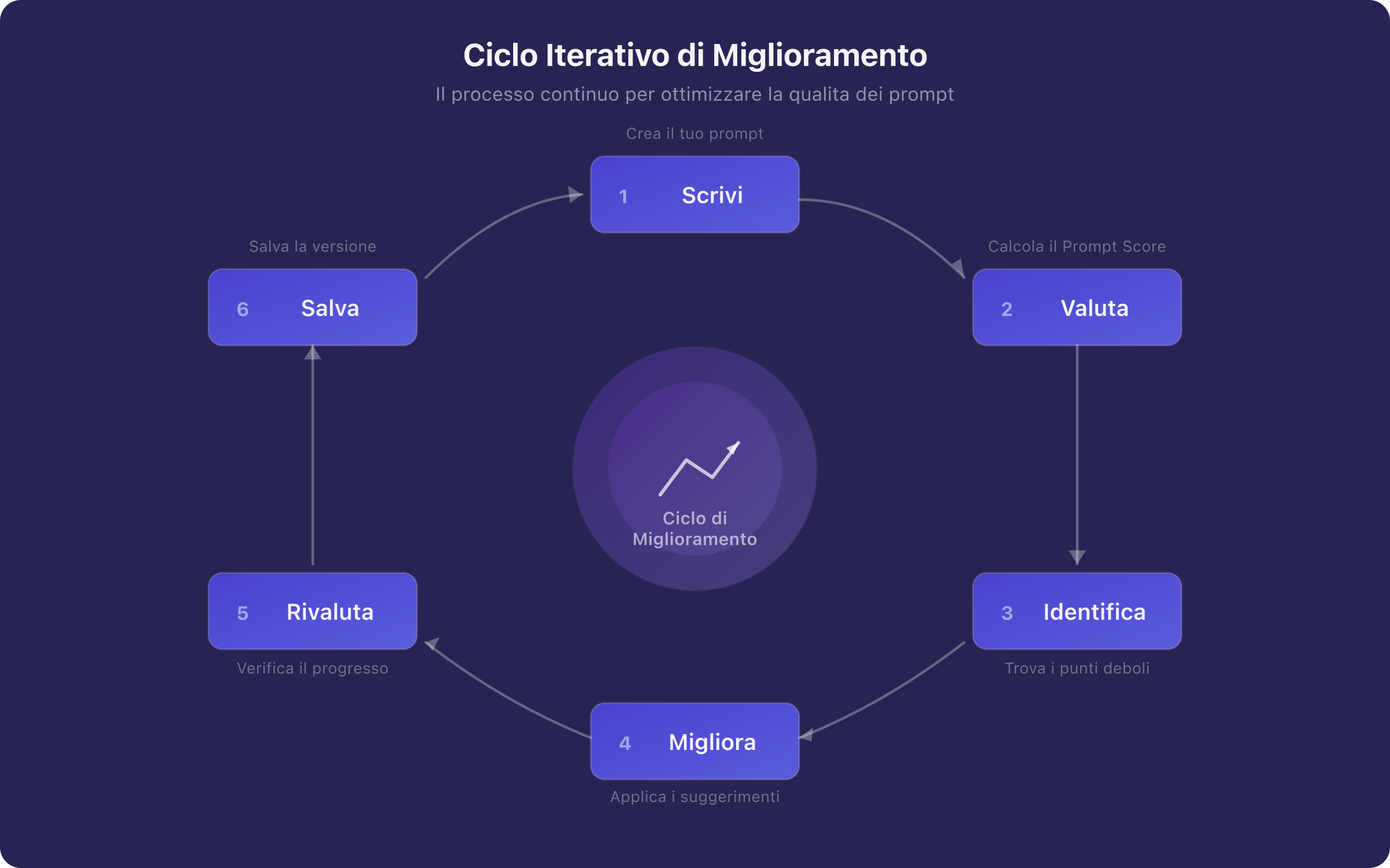 Figura 3. Il ciclo iterativo di miglioramento del prompt guidato dal Prompt Score. Ogni iterazione è informata dalla diagnostica per criterio, permettendo miglioramenti mirati. Il tracciamento storico delle versioni con snapshot del punteggio rende visibile l'evoluzione della qualità.