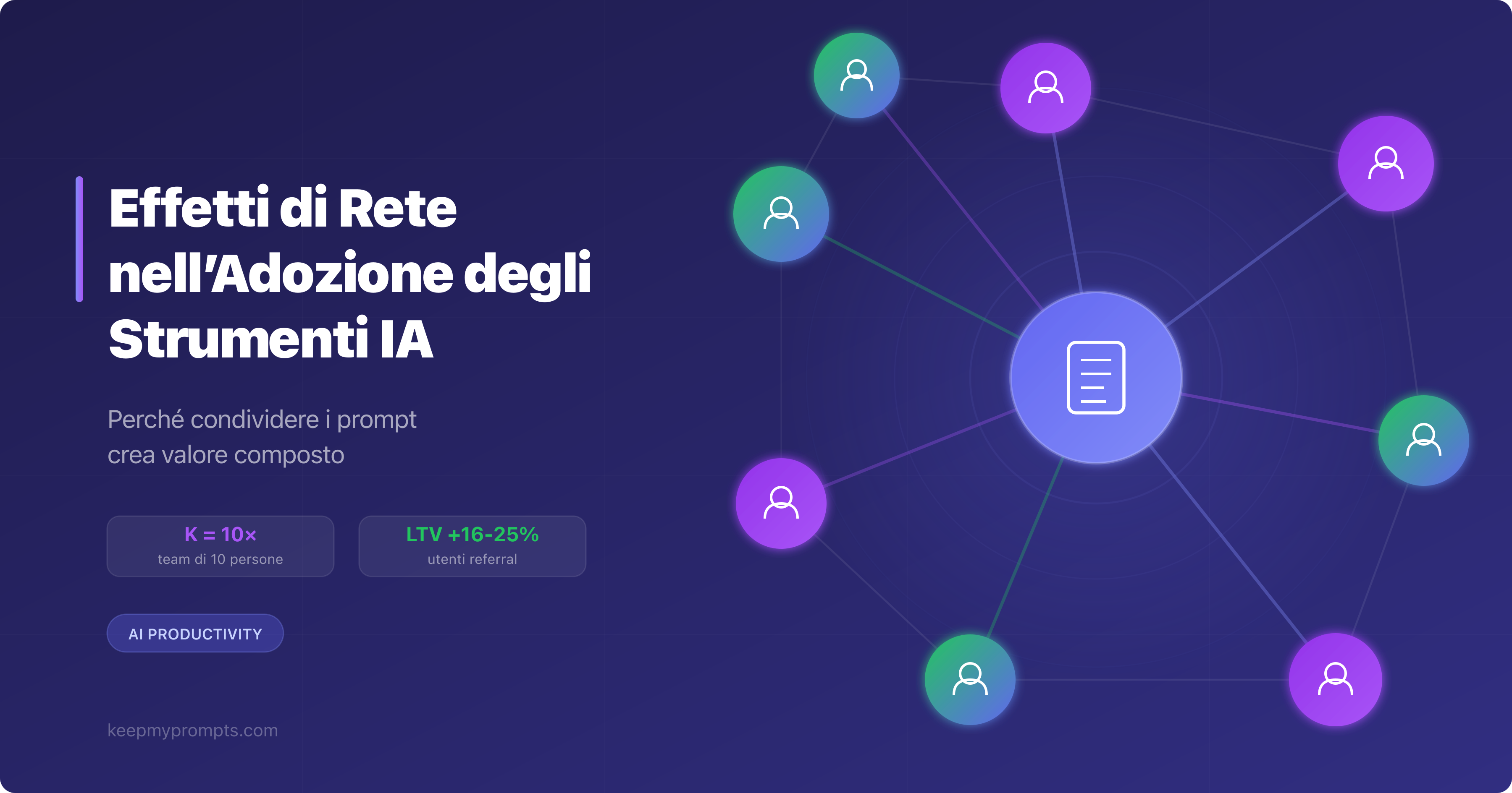 Il presente articolo propone una tesi specifica: quando più persone nella stessa organizzazione o rete professionale utilizzano lo stesso sistema di gestione dei prompt, il valore generato non è additivo ma moltiplicativo. Si tratta di un fenomeno che la letteratura economica definisce effetto di rete (network effect), ampiamente documentato nelle telecomunicazioni e nelle piattaforme digitali, ma ancora poco esplorato nel contesto degli strumenti IA.