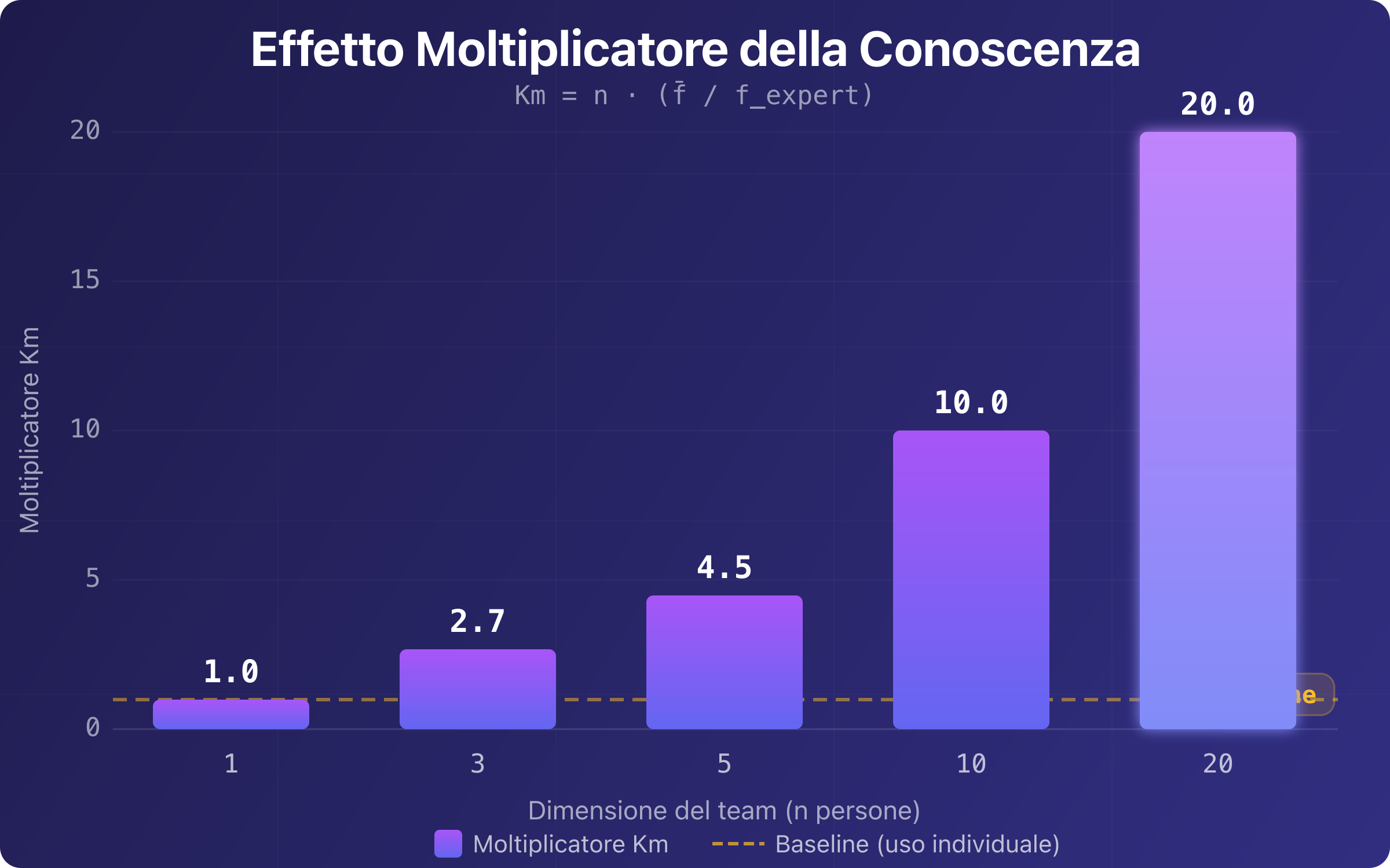 Figura 1. Il valore di un prompt condiviso cresce linearmente con il numero di utilizzatori nella rete. Il passaggio da uso individuale a condivisione con soli 3 colleghi triplica il valore generato.