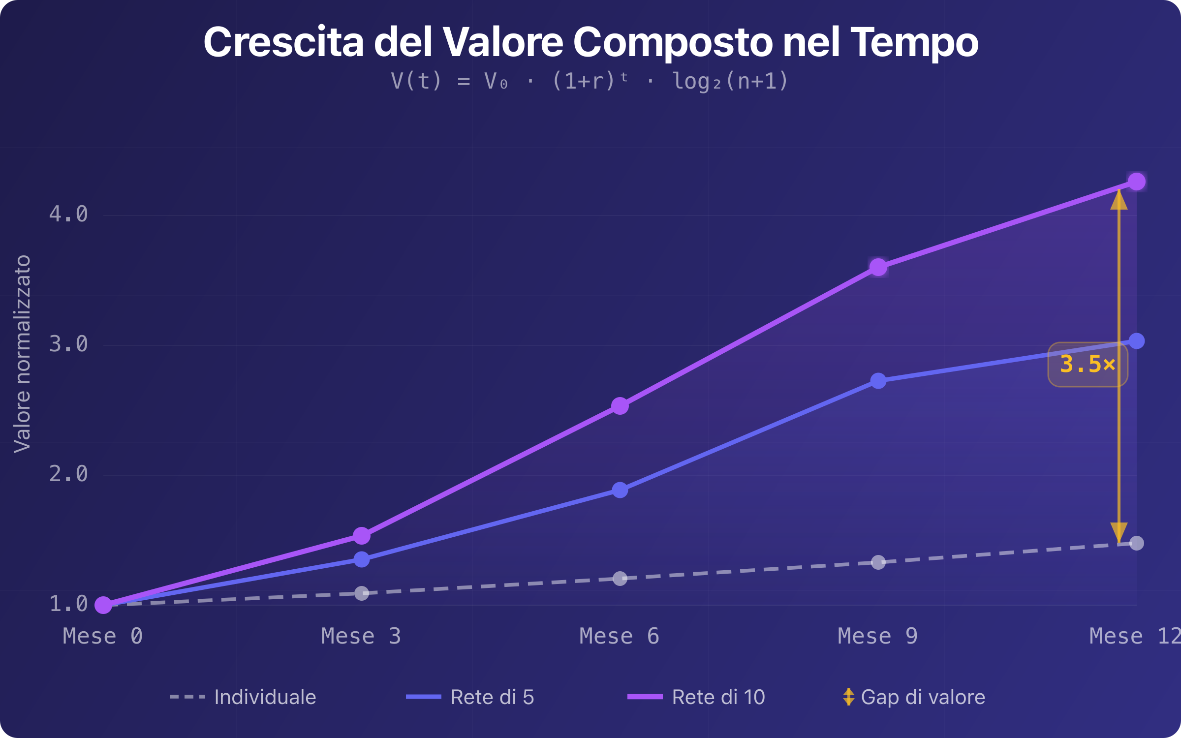 Figura 2. La divergenza tra utente singolo e rete di 10 si amplifica nel tempo. Dopo 12 mesi, la rete genera un valore 3,5 volte superiore all'utente individuale, e il gap continua ad allargarsi.