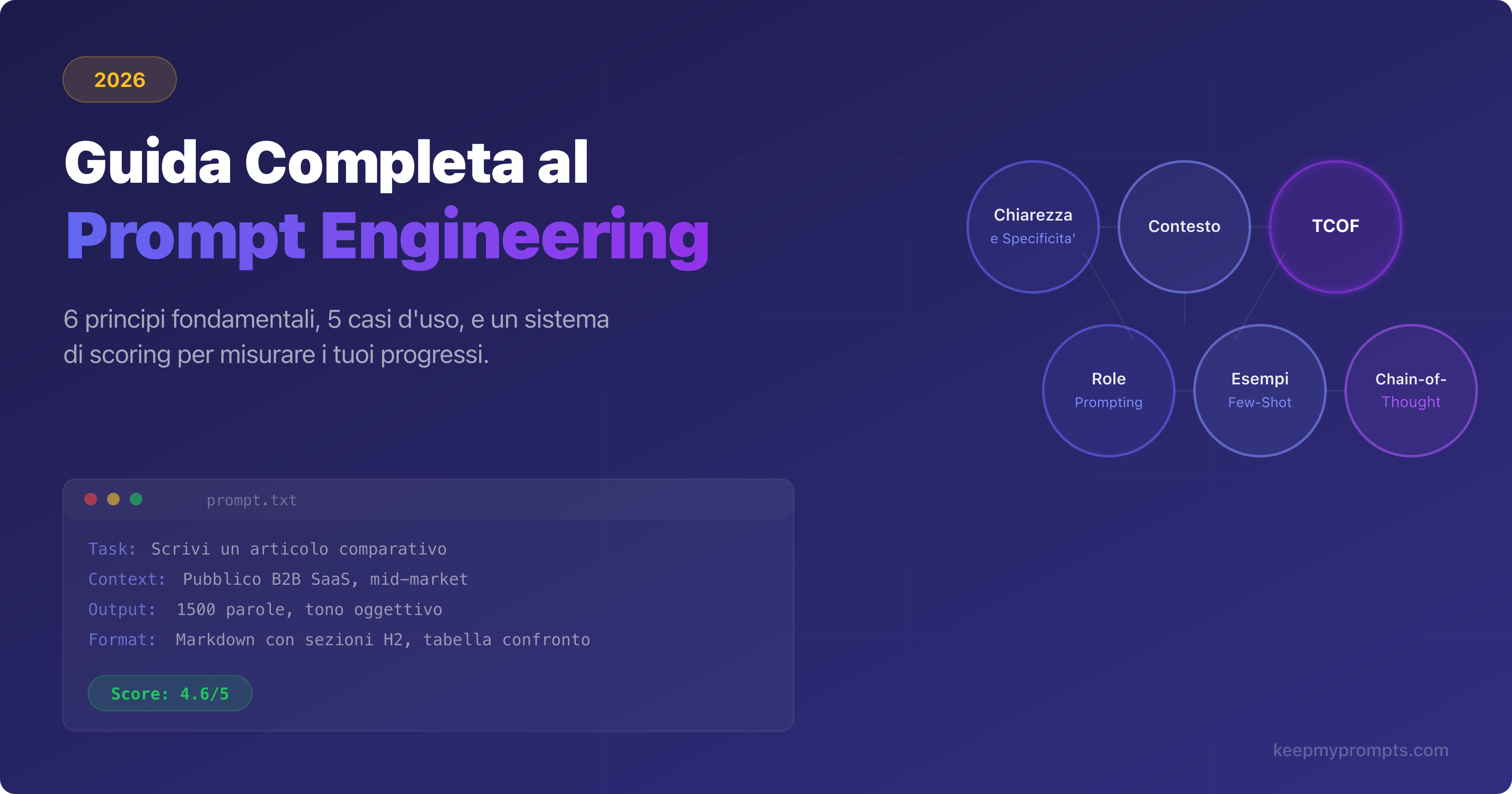 Questa guida copre tutto quello che serve sapere: i principi fondamentali, le tecniche pratiche per diversi casi d'uso, gli errori piu' comuni, e come misurare se i tuoi prompt stanno effettivamente migliorando. Che tu sia un marketer che prepara campagne, uno sviluppatore che automatizza code review, o un ricercatore che sintetizza paper, i principi qui descritti funzionano con ogni modello e ogni tipo di compito.